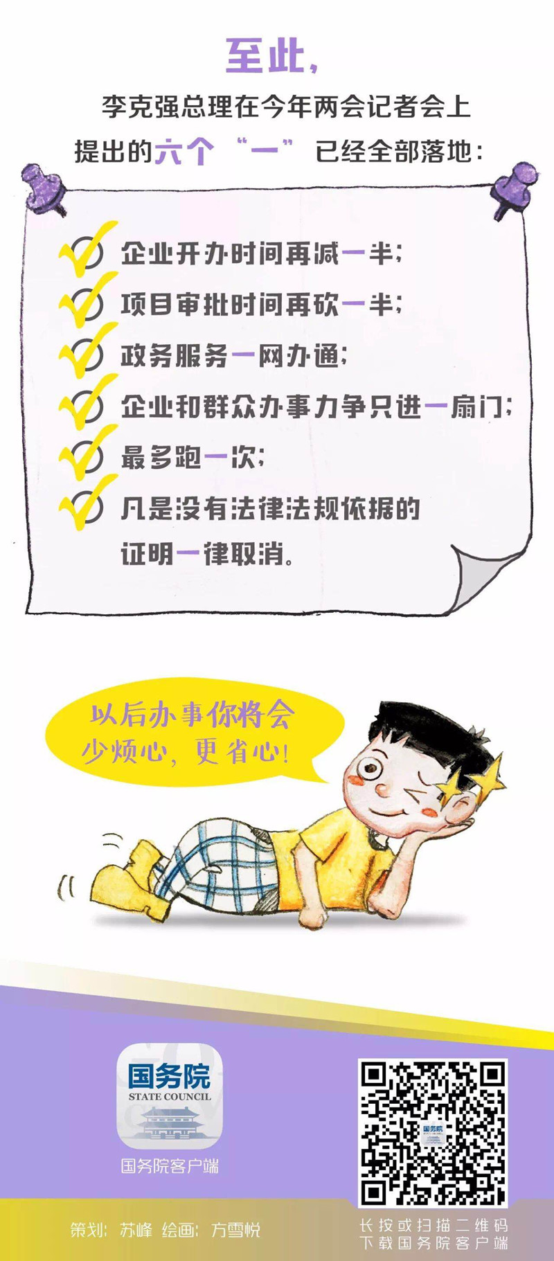李克強(qiáng)總理在今年兩會(huì)記者會(huì)上說,放寬市場(chǎng)準(zhǔn)入今年要在六個(gè)方面下硬功夫,也可形象地說成六個(gè)“一”:企業(yè)開辦時(shí)間再減一半;項(xiàng)目審批時(shí)間再砍一半;政務(wù)服務(wù)一網(wǎng)辦通;企業(yè)和群眾辦事力爭(zhēng)只進(jìn)一扇門;最多跑一次;凡是沒有法律法規(guī)依據(jù)的證明一律取消。這六個(gè)“一”都是減,再加上減稅、減費(fèi),這些都是動(dòng)政府“奶酪”的,是傷筋動(dòng)骨的改革。
